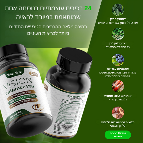 חוו ראייה ברורה, חדה ונעימה יותר עם VisionEase™ נוסחה שפותחה קלינית לתמיכה בעיניים שנועדה להזין, להגן ולשקם את הראייה מבפנים. כל קפסולה מספקת רכיבים ממוקדים שמחזקים את הרשתית, מגנים מפני מאמץ דיגיטלי ותומכים בחדות ראייה לאורך זמן — כדי שתוכלו לראות ולחוות את החיים בצבע מלא שוב.
